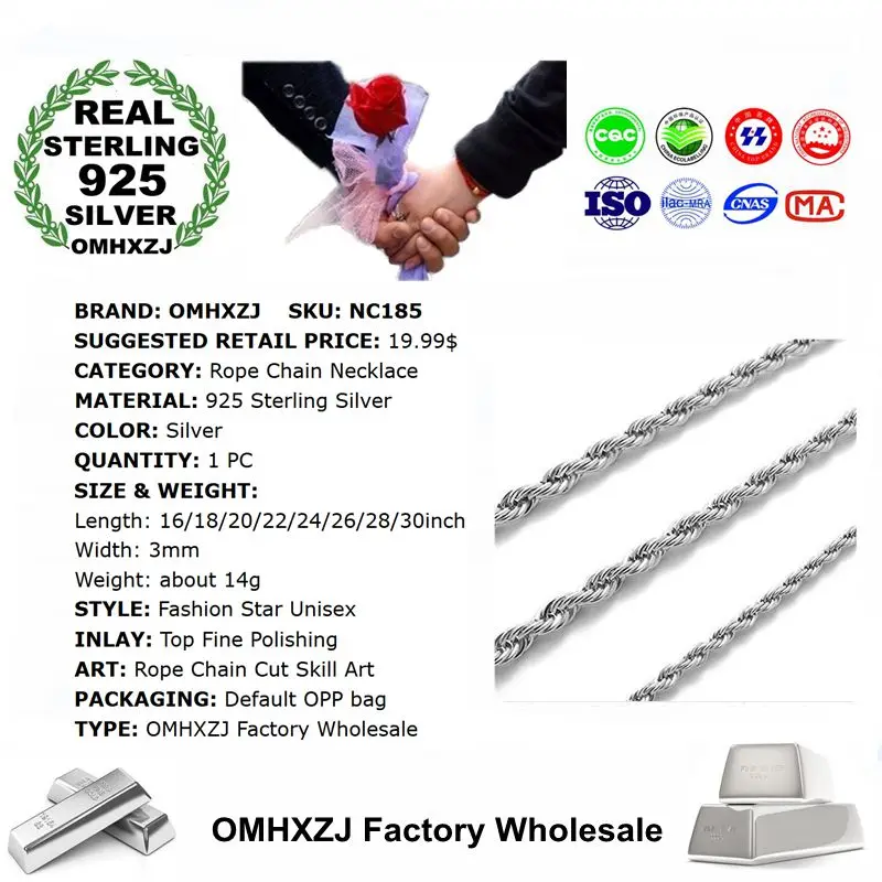Most effective OMHXZJ Wholesale Personality Fashion Unisex Party Wedding Gift Silver 3MM Rope Chain 925 Sterling S