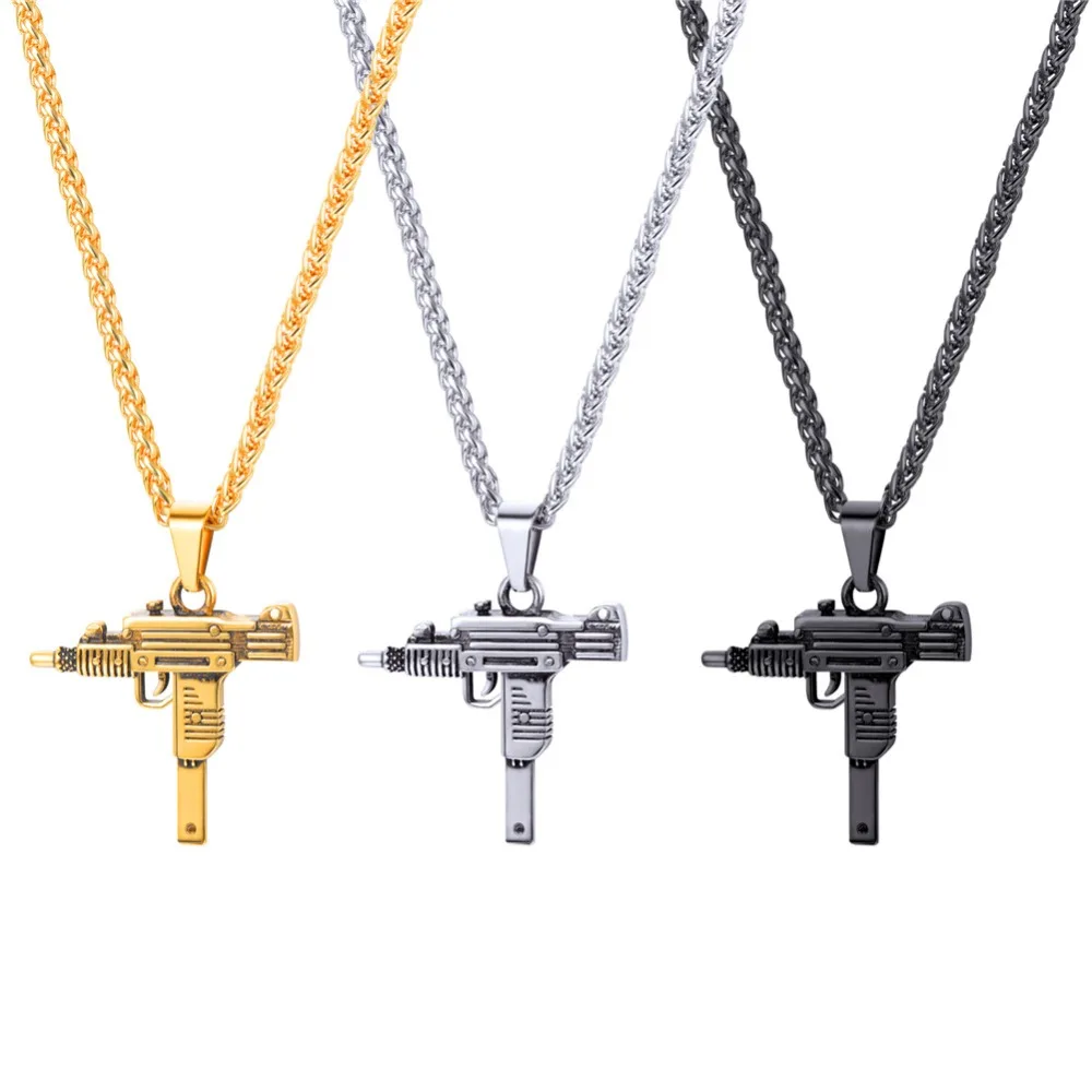 price reduction U7 UZI GUN Shape Pendant Necklace For Men Hip Hop Jewelry Gold/Black Color Stainless Steel Army Sty