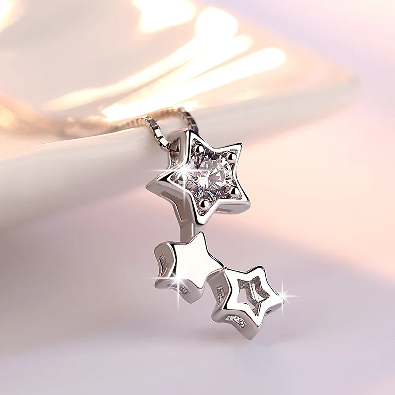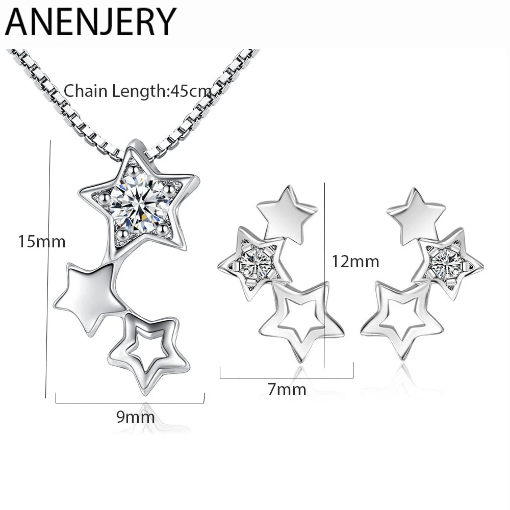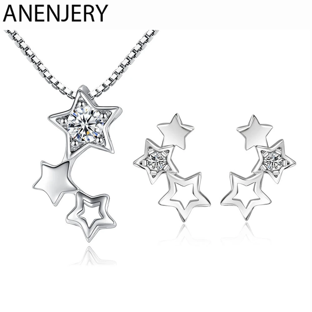 astounding ANENJERY 925 Sterling Silver Jewelry Sets Simple Zircon Star Necklace+Earrings For Women Girl Gift