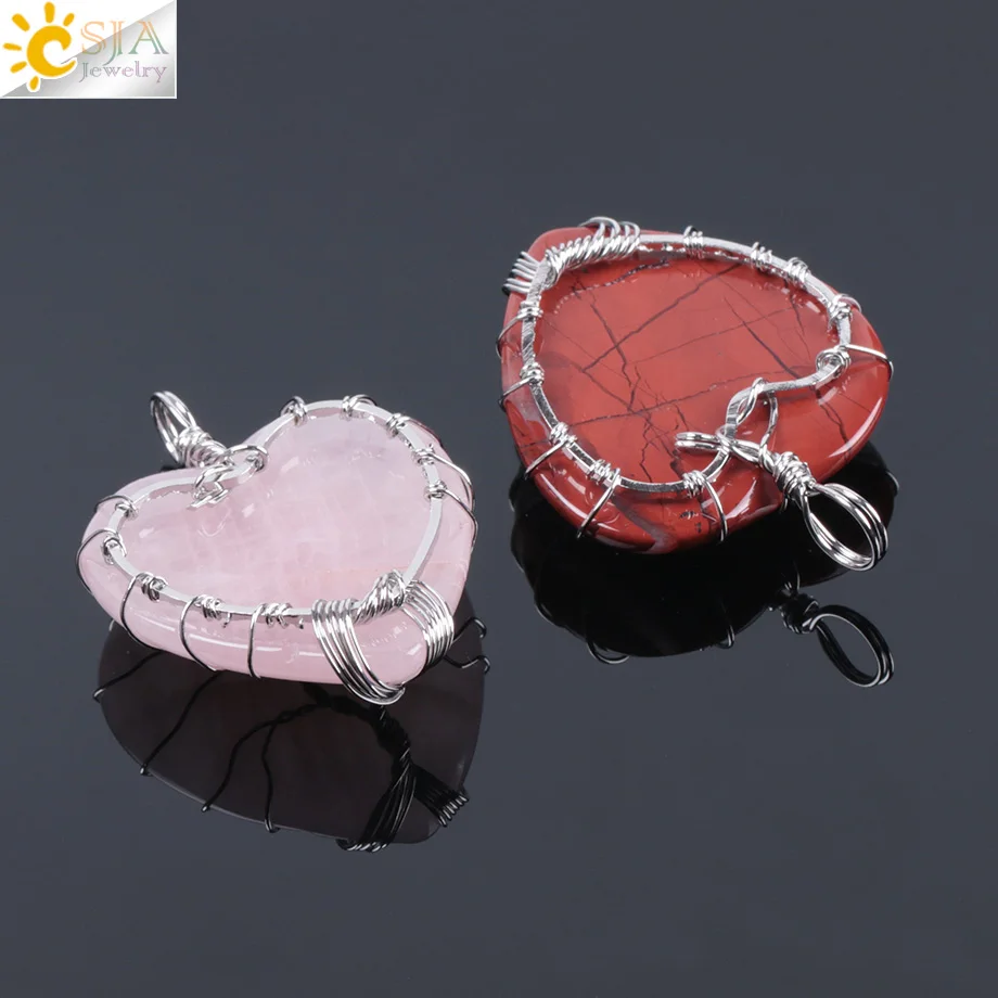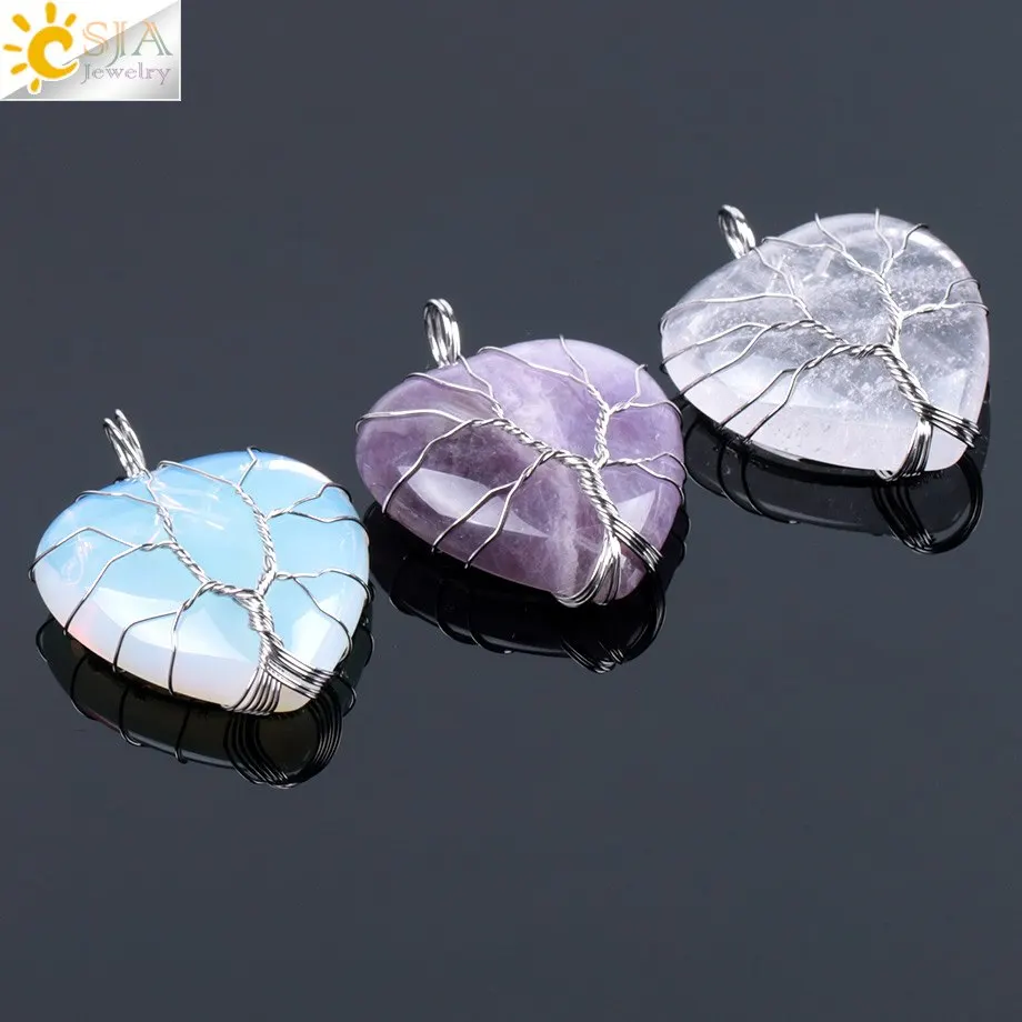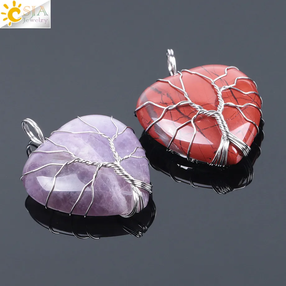 Best CSJA Tree of Life Wire Wrapped Love Heart Necklace & Pendant Suspension Natural Gem Stone Tiger Eye
